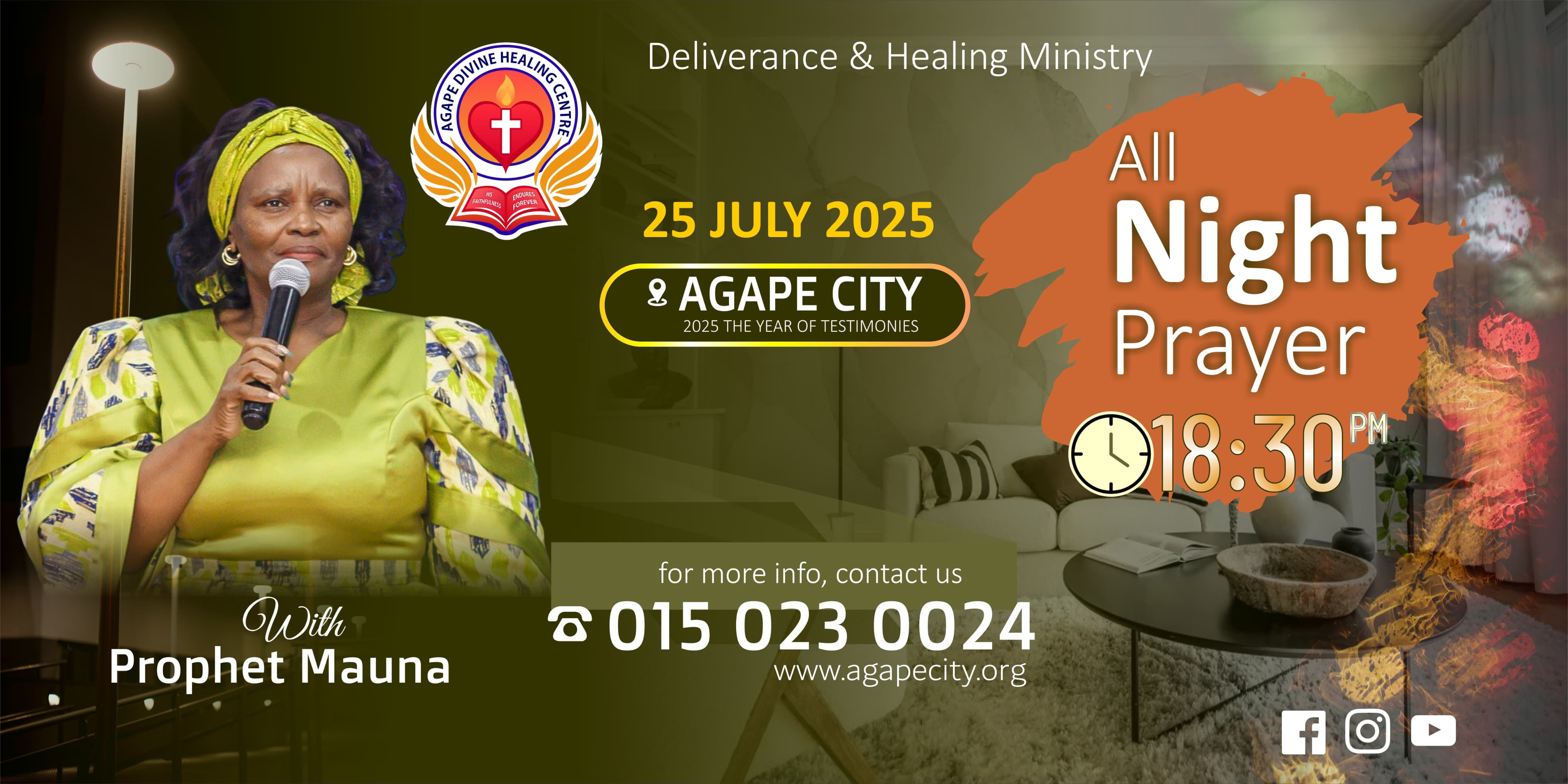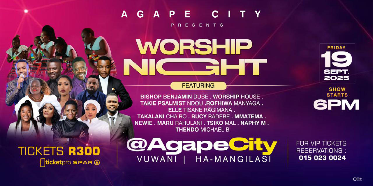 Come join us at Agape City, Ha-Mangilasi Vuwani, Worship Night 19 September 2025 Show starts at 6PM. Get your ticket TICKET PRO SPAR R300, For VIP tickets reservation 015 023 0024